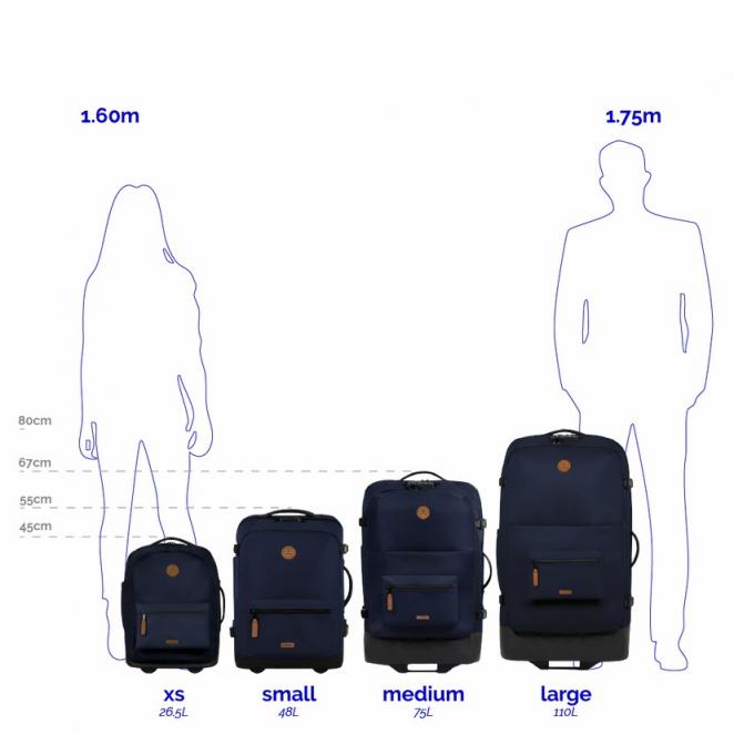 Garantie à vie Bretelles pour la porter sur le dos Housse de pluie pour couvrir les roues et éviter les salissures en mode sac à dos Compartiment ordinateur accessible à l’avant (Compatible avec ordinateur 14 pouces) Poche gourde extérieure 1 poignée haute et 1 poignée latérale 1 poignée télescopique + 2 roues remplaçables Poche arrière pour y ranger le téléphone ou passeport Vegan et déperlante Pour en savoir plus sur la compatibilité avec les compagnies aériennes : ici
